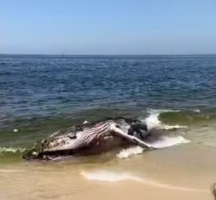 Uma baleia-jubarte apareceu morta no mar da praia de Itaipuaçu, em Maricá, na Região Metropolitana do Rio, na manhã desta sexta-feira (26).
