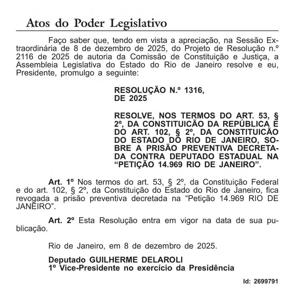 A decisão do plenário da Assembleia Legislativa do Rio de Janeiro (Alerj) de revogar a prisão do deputado estadual Rodrigo Bacellar foi publicada no Diário Oficial desta terça-feira (9).