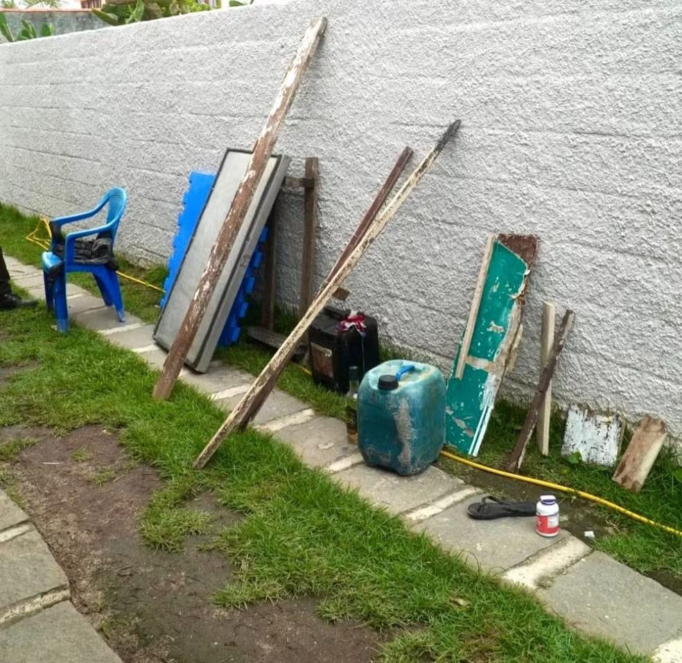Pedaços de madeira, galões, uma garrafa de bebida alcoólica e um chinelo estão entre os itens encontrados.