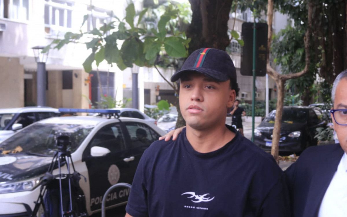 Vitor Hugo Simonin, de 18 anos, chegou na 12ª DP, em Copacabana, acompanhado do seu advogado