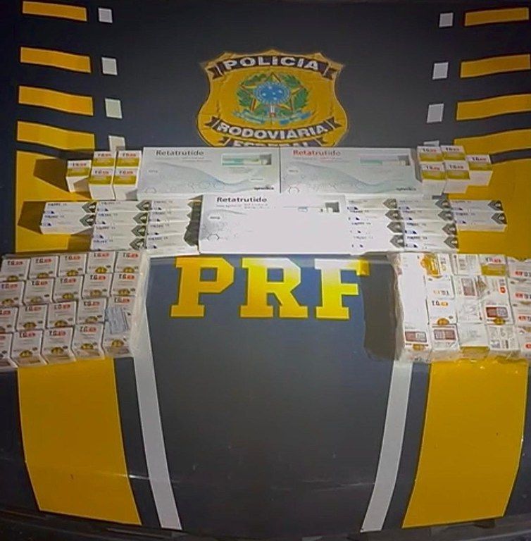 No interior do automóvel foram encontradas diversas embalagens de medicamentos, sendo: 50 caixas com 4 unidades cada, de Tirzepatida 15mg; 20 caixas de Tirzepatida 15mg e 3 Canetas de Retatrutide 40mg.